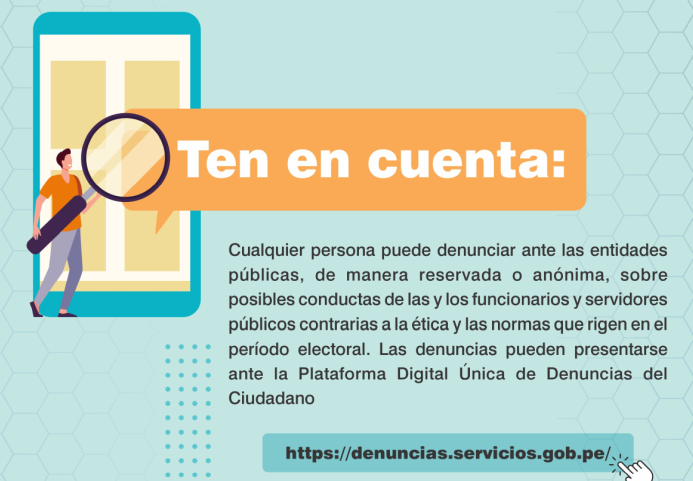 Cualquier persona puede denunciar ante las entidades públicas, de manera reservada o anónima, sobre posibles conductas de las y los funcionarios y servidores públicos contrarias a la ética y las normas que rigen en el período electoral. Las denuncias pueden presentarse ante la Plataforma Digital Única de Denuncias del Ciudadano https://denuncias.servicios.gob.pe, o por cualquier otro medio, en cuyo caso también serán derivadas a la Unidad Funcional de Integridad del INGEMMET, para iniciar las gestiones correspondientes y, de corresponder, encausar el caso ante las autoridades competentes.